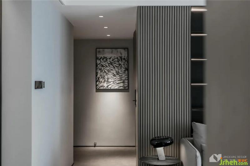繁復(fù)的紋理、材質(zhì),分割出純灰度空間的層次,光影交織、高柜儼然,引入歸家儀式感。