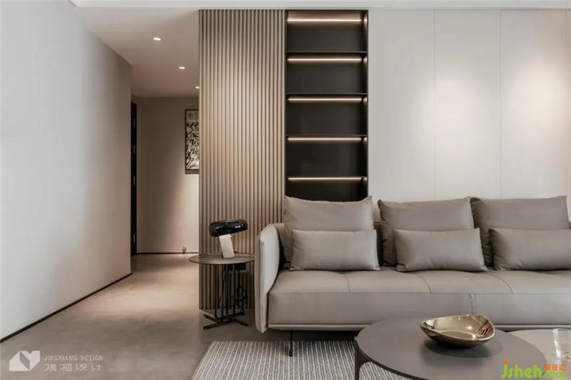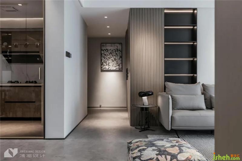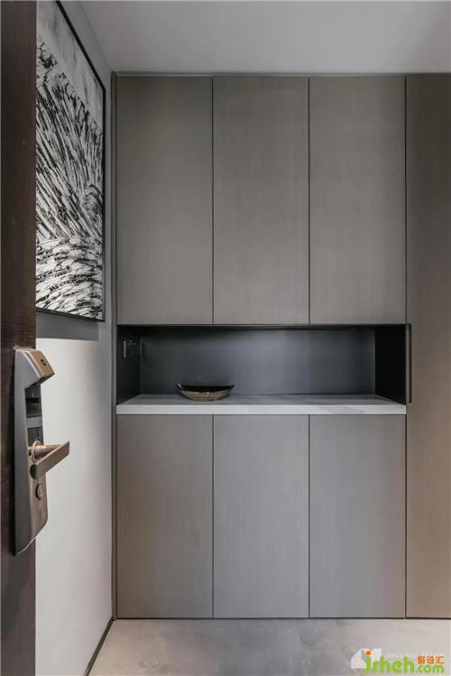 The complex textures and materials divide the level of pure gray space, the light and shadow are intertwined, and the tall cabinets seem to introduce a sense of homecoming ceremony.