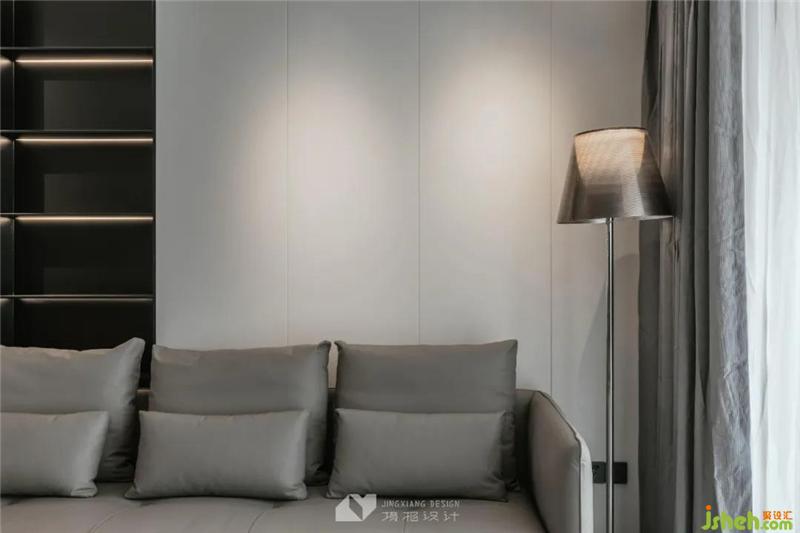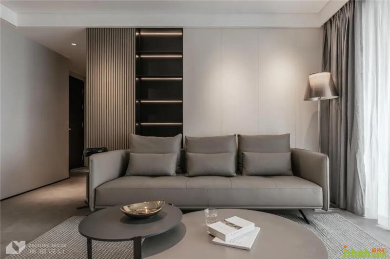 With wooden grille elements as the connection point, both sides of the space form a viewing point. The wall is embedded with black open grids, supplemented by soft light strips, combined with hidden and exposed.