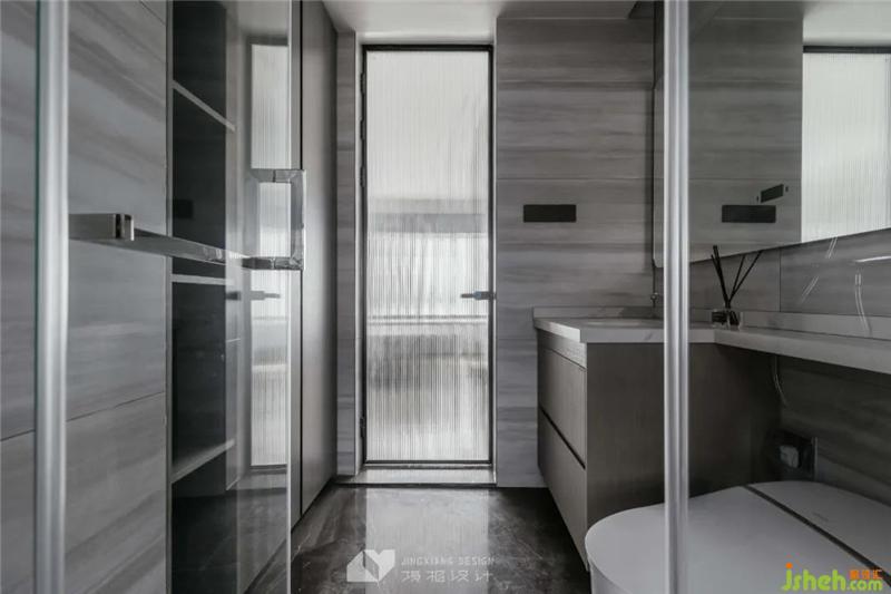 The dark color is the public bathroom, which contrasts sharply with the pure white bathroom appliances, which is stable and generous. The bay window is designed as an alcove, and the corner space can be used perfectly.
