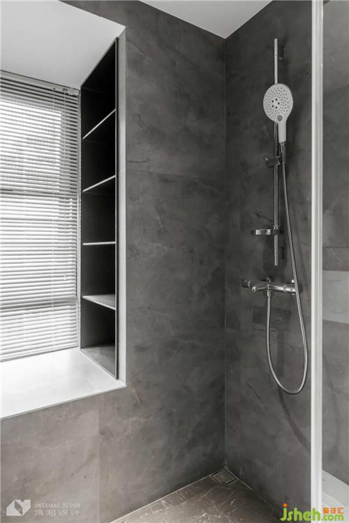 深色系公衛(wèi),與純白衛(wèi)浴用具對(duì)比鮮明,更顯穩(wěn)重大方。飄窗設(shè)計(jì)壁龕,犄角空間得以完美利用。