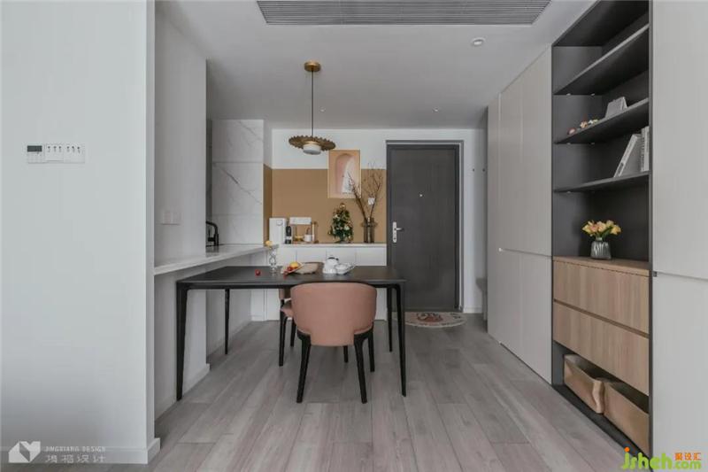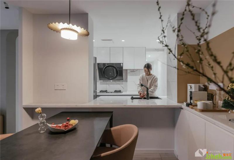 Open the kitchen, semi open design, let the kitchen space connect and interact, and give the family more communication space. White mystery increases visual space and broadens vision.Behind the dining table, a sideboard cabinet integrated with the island platform is built, which can be used for storage at the bottom and display platform at the top.