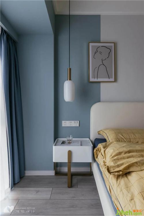 純凈白+霧霾藍的拼色背景墻,深圳裝修設計營造出朗闊又溫馨的臥室氛圍,淡黃色床具,仿若把陽光蓋在身上,讓屋主每一天都有好睡眠。藍色窗簾與墻色相呼應,周末睡個懶覺,厚厚的簾布也能保證屋主不被陽光打擾,拉開窗簾,布體重疊間,窗簾成為臥室天然的裙擺。