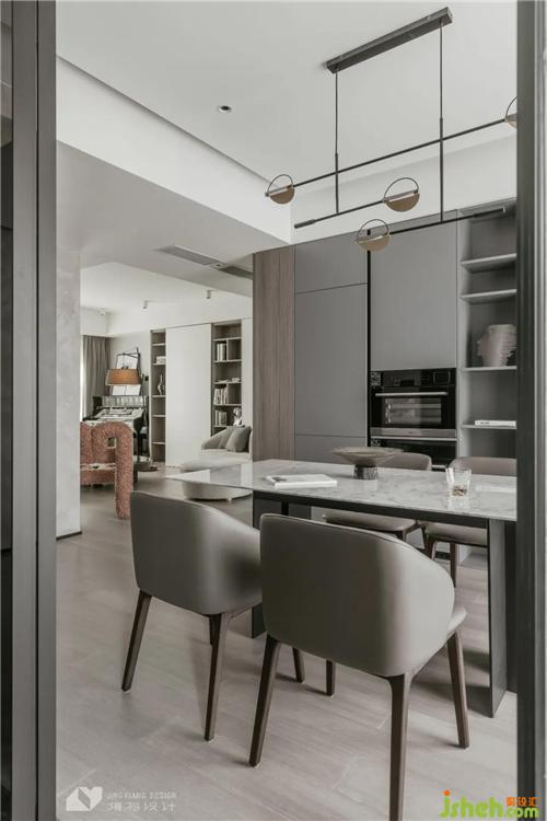 為了加強(qiáng)用餐者的感官體驗(yàn),餐邊柜以樺木紋與高級(jí)灰裝飾,空間整體呈現(xiàn)出十分內(nèi)向的性格,陽(yáng)臺(tái)引入的光線灑落其上,不同材質(zhì)與顏色賦予空間更強(qiáng)的韻律感。餐桌上方吊燈,通過(guò)線條燈架分出燈光層次,暗合餐廳整體風(fēng)格,通過(guò)光線,餐廳空間更顯主次分明。