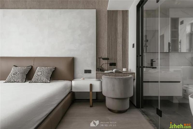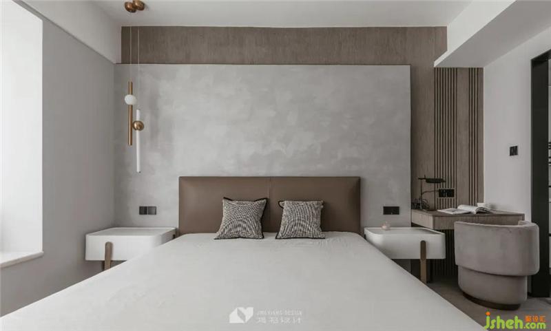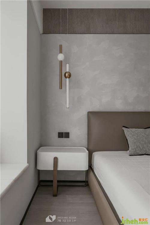 床頭兩側(cè)布置不一味追求對(duì)稱統(tǒng)一,白色簡(jiǎn)約柜體以黃銅線條支撐,簡(jiǎn)約中顯露出輕奢品質(zhì)。以吊燈打破對(duì)稱形成的呆板乏味,線條形吊燈光線柔和溫暖深圳室內(nèi)設(shè)計(jì)師,靜謐夜晚,一盞明亮的燈,也可成為心靈歸所。另一側(cè)利用空間轉(zhuǎn)角布置書桌,一天勞累,可在睡前于書中尋找自在天地。