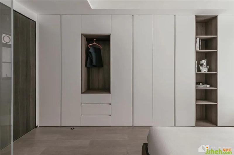 床尾儲(chǔ)物柜,為私人空間增加儲(chǔ)物區(qū),足不出戶臥室既可收納衣物家私。白色柜體與頂部色彩保持一致,又因上飾的利落線條形成了獨(dú)特視覺(jué)觀感。設(shè)計(jì)手法正如一首卡農(nóng)曲,在看似反復(fù)平常的進(jìn)行中,鳴奏出多種音色效果。