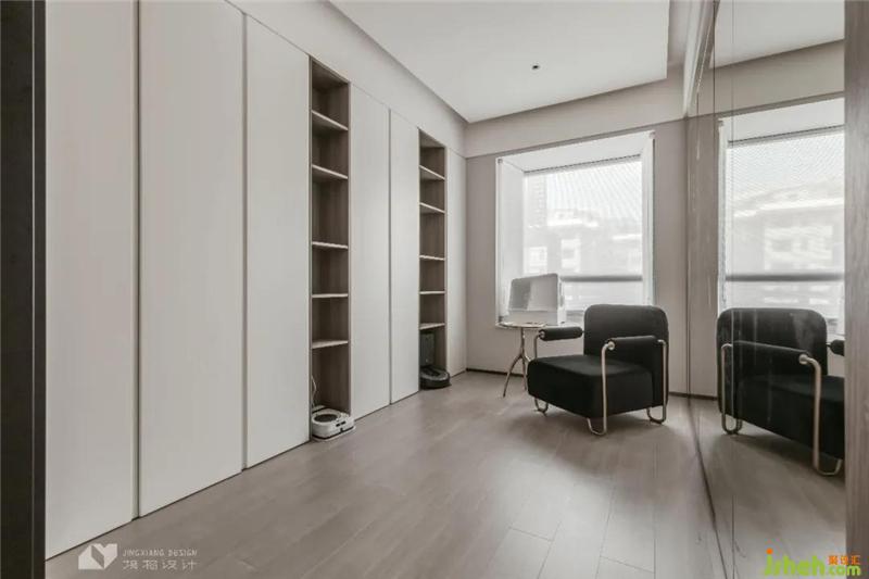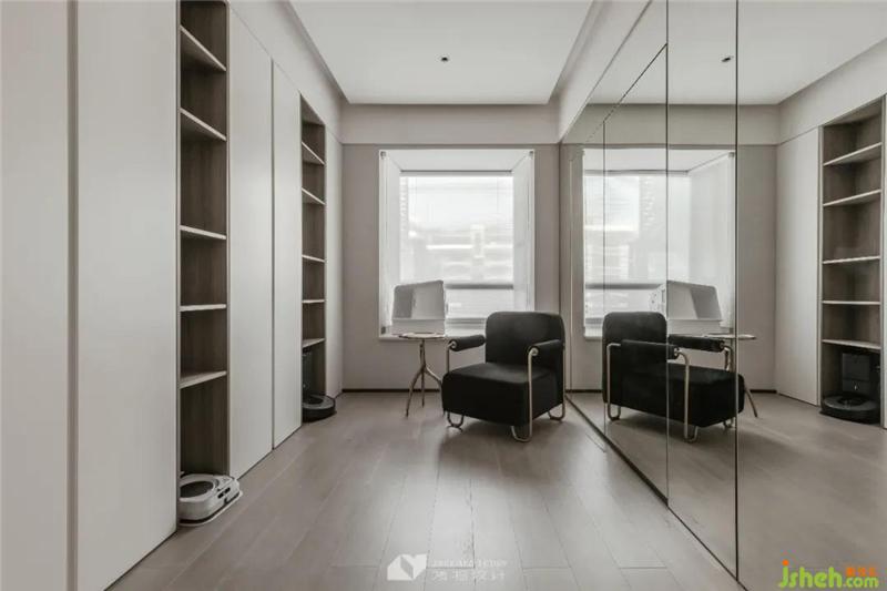 一側(cè)柜體整面鋪貼鏡子,利用鏡像反射原理視覺(jué)上增大空間,同時(shí)也為屋主練習(xí)瑜伽提供便利。兩側(cè)墻面對(duì)照,鏡子模糊了空間界限,簡(jiǎn)約空間中也能意趣叢生。