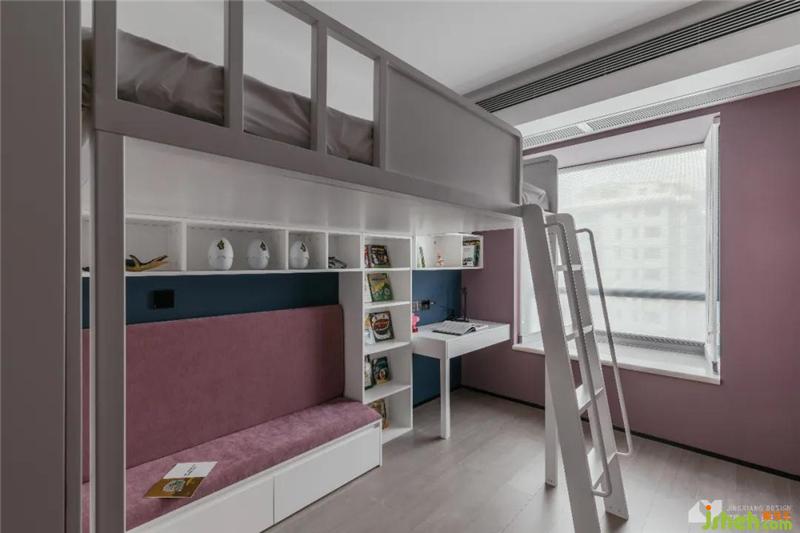 兒童房以色為名,粉、紫、灰、白、藍(lán),色彩交織中打造出孩子心中的夢(mèng)想居所。高低床下方挑空,預(yù)留空間布置開放格儲(chǔ)物柜、沙發(fā)椅等,空間利用最大化。床梯把手設(shè)計(jì),保護(hù)孩子上下床安全。小空間里孩子自在舒適成長(zhǎng)生活。