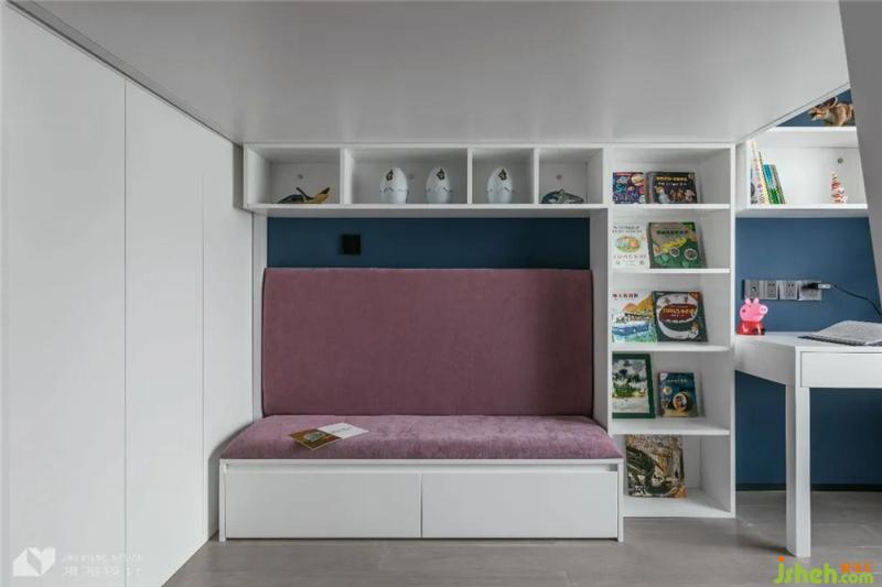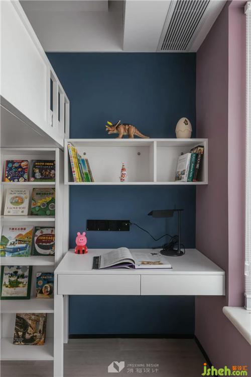 床與陽臺隔墻夾角搭出書桌書架,成為孩子的學(xué)習(xí)一角。靜謐藍與夢幻粉將孩子的童趣融入空間設(shè)計,白色調(diào)和下空間有了更多可解讀的內(nèi)容。