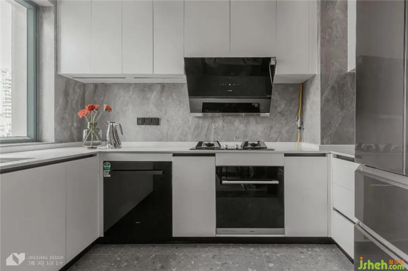 U形廚房布置契合烹飪動線,黑白簡約色調(diào),顏值不落,實用性不減。開火做飯,煎炒烹炸打破黑白灰的單調(diào)冷寂。