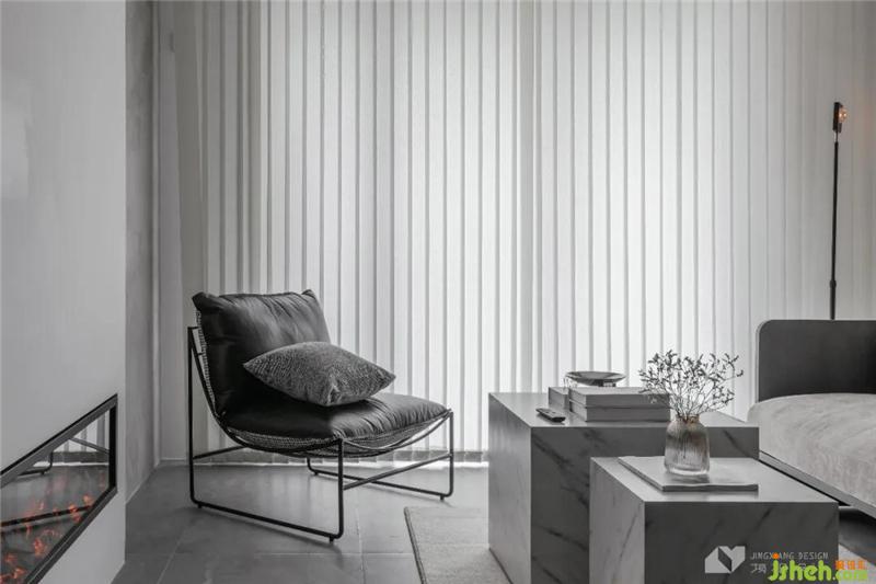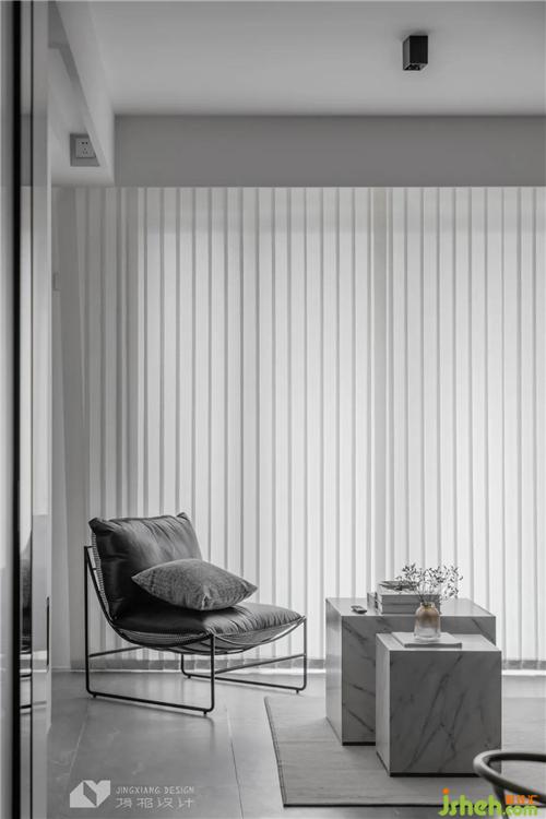客廳陽臺布置洗衣機、烘干機,并設(shè)計出一個小吧臺,一個空間,兩種功能,用設(shè)計將室內(nèi)的每一分空間利用到極致。經(jīng)豎百葉過濾后的光線明媚柔和,自然光線暈染之下,客廳有了黑白膠片電影質(zhì)感。簡單的配色讓空間故事感十足。搭上一張構(gòu)架感十足的單人椅,放松閑坐時,靜聽光陰的故事。