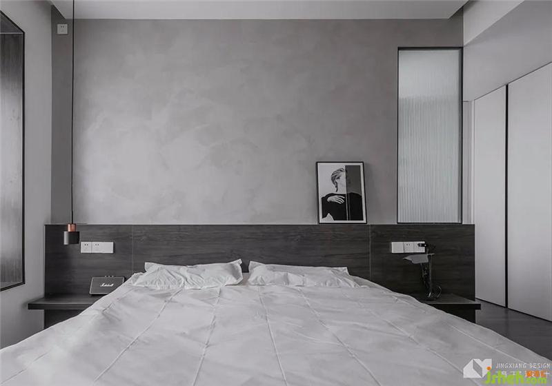 主臥開門融于沙發(fā)背景墻,門體加高并做隱形設(shè)計,視覺上拉伸層高,小空間中有了大氣朗闊之感。一側(cè)黑色格柵,線條利落,為空間注入一抹靈動悠然。
