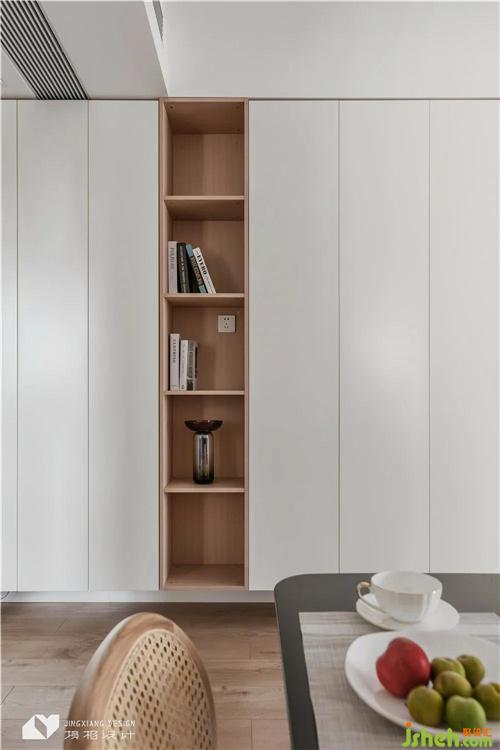 整排儲物柜從玄關延伸至客廳,以柜體串聯(lián)起三個空間,增加空間整體感觀。綿延的柜子也讓公共活動區(qū)有了強大的收納能力。局部開放格設計可做一方書柜,放上收藏擺件,裝飾小物,又是展現(xiàn)屋主愛好的興趣一角。