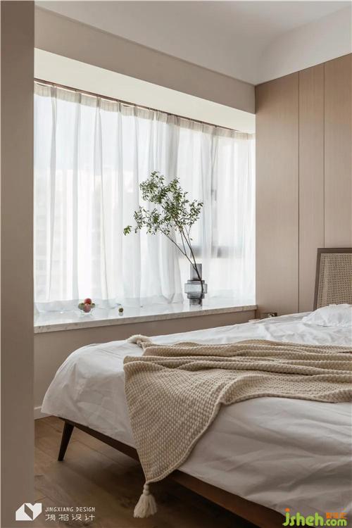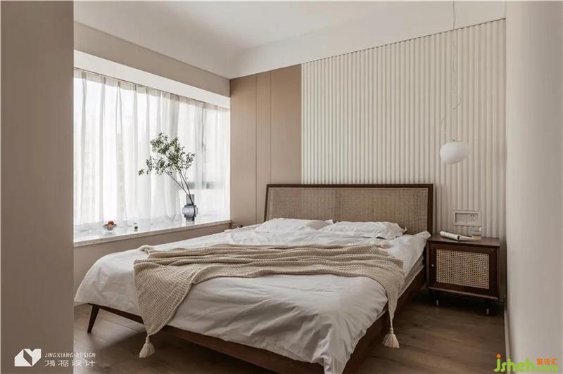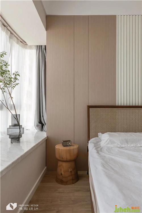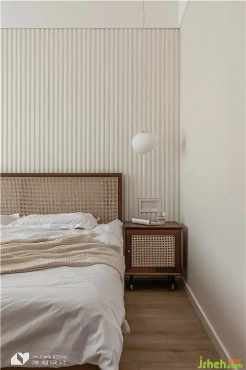床頭兩側(cè)小柜形態(tài)各異,展現(xiàn)出非對稱美感。一側(cè)小柜與床頭上的藤編元素呼應,家具在視覺上更為和諧統(tǒng)一。另一側(cè)選擇木質(zhì)床頭凳,木材生長產(chǎn)生的紋理,讓空間有了跨越時空的悠長韻味。