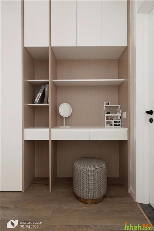 臥室進門一側(cè)布置通頂柜,作為休憩空間的收納主力區(qū)。儲物柜與梳妝臺結(jié)合,給女屋主留下對鏡梳妝之處。梳妝臺上方以柜體板做出分層,充分利用縱向空間,增加柜子收納能力。臺面下方留有充足高度,方便屋主坐下梳妝時舒展雙腿,細微之處的考慮展現(xiàn)設計師人性化的設計理念。