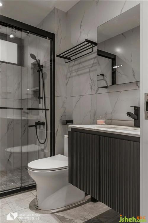 The integrated basin is selected for the toilet to facilitate cleaning and care. The lower part is designed with lockers, and the table top of Jiefang washing table. The cabinet body is wrapped with dark great wall board in the same color, which is more hierarchical visually.