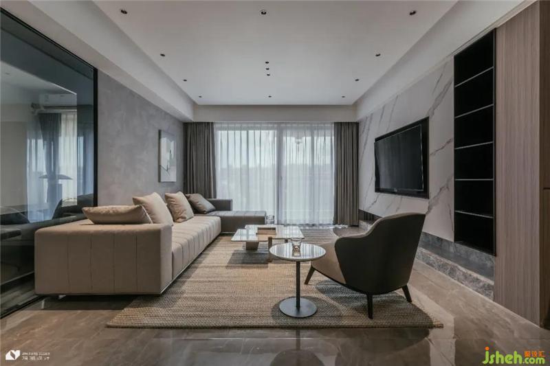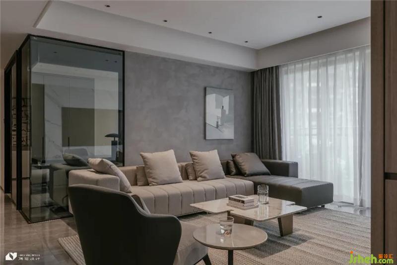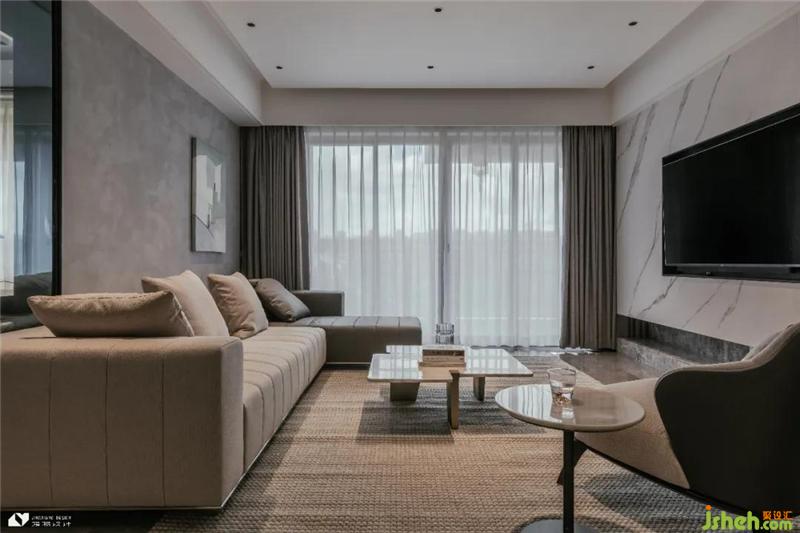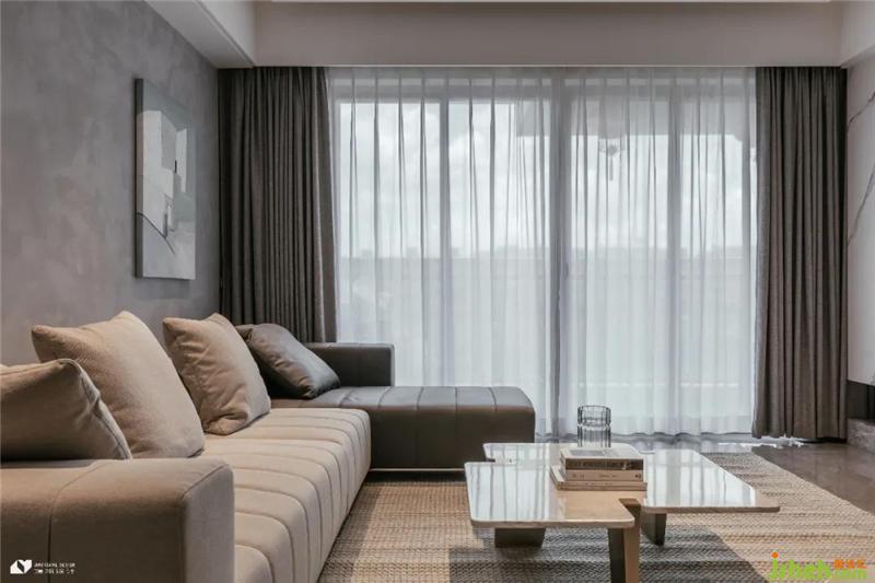陽臺與客廳以通透玻璃移門隔開,純凈玻璃似有若無,視覺上兩個區(qū)域合二為一,盡顯大氣通透。白色紗簾將入戶光線打散,溫柔灑落于暗色系空間,明媚自然光給內(nèi)斂低調(diào)的客廳注入一抹暖意,撫去居者歸家后的滿身疲憊。