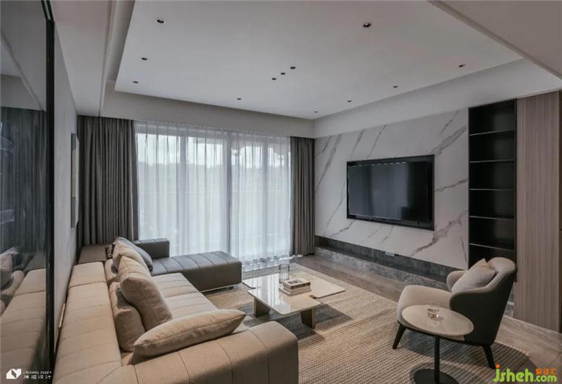 紋理鮮明,條紋利落的地毯豐富客廳視覺層次。組合型沙發(fā)邊角規(guī)整,與小幾形狀暗相呼應(yīng)。三排隱藏筒燈排布有序深圳裝修設(shè)計,多光源落于空間,光域交錯,空間光影交織,氛圍更加溫馨。白色大理巖板上墻,素雅的電視背景墻呼應(yīng)空間整體簡約格調(diào)。