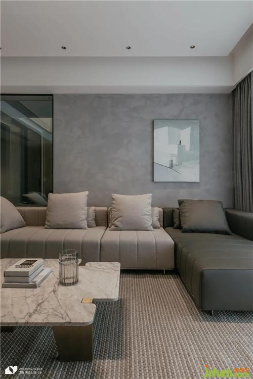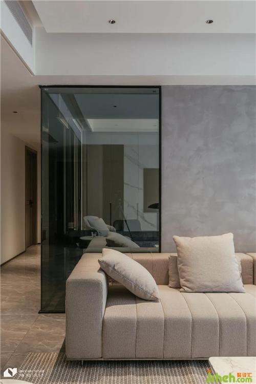 沙發(fā)背景墻上飾水泥質(zhì)感藝術(shù)漆,灰色斑駁墻面增強空間藝術(shù)張力,簡約裝飾畫是墻面點睛一筆,成為自然素樸與現(xiàn)代精致連接的關(guān)鍵樞紐。背景墻局部以玻璃代替實體隔墻,從客廳到書房,從熱鬧互動到靜謐閱讀,客廳與書房聯(lián)通互動。
