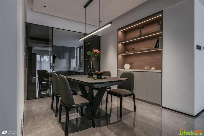 墻體拆改,設(shè)計出規(guī)整餐廳。餐廳與廚房因通透玻璃門互動性增強。餐島一體設(shè)計,減少深色系空間中的壓抑清冷,上方一字型吊燈形成光域,包裹餐桌,經(jīng)過明與暗的禮贊,餐桌材質(zhì)展露出更多歲月的痕跡。