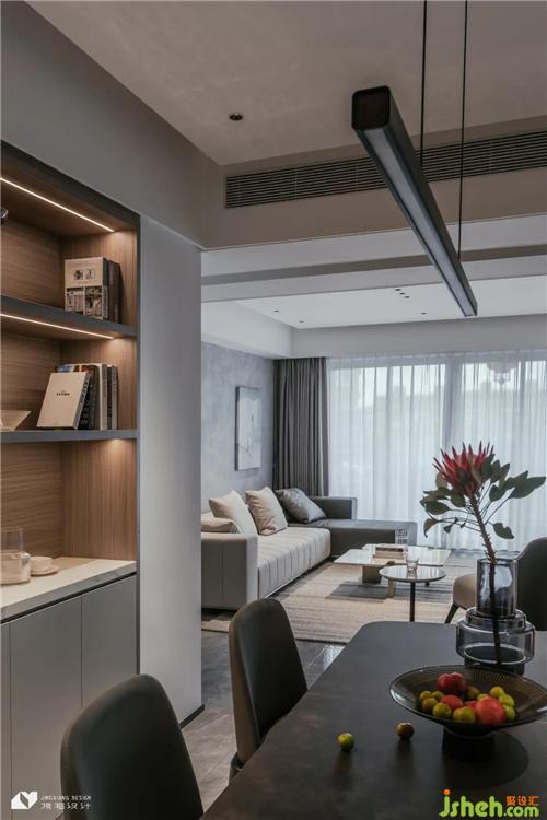 餐廳磚墻部分墻體內(nèi)推,借用衛(wèi)生間部分面積,設(shè)計餐邊柜,柜體上方嵌入輕巧隔板,做分層置物架,縱向儲物深圳裝修設(shè)計,空間得以最大化利用。隔板下方配置燈光系統(tǒng),弱化傳統(tǒng)收納柜的呆板無趣,打造更具趣味的儲物空間。