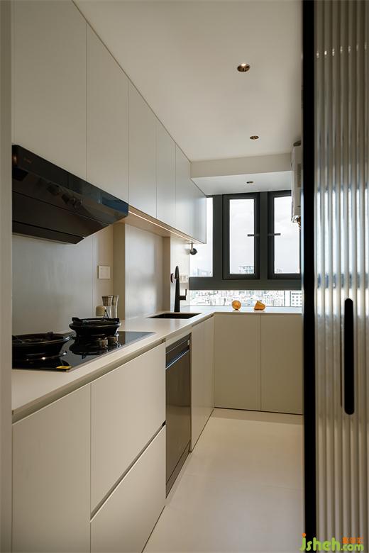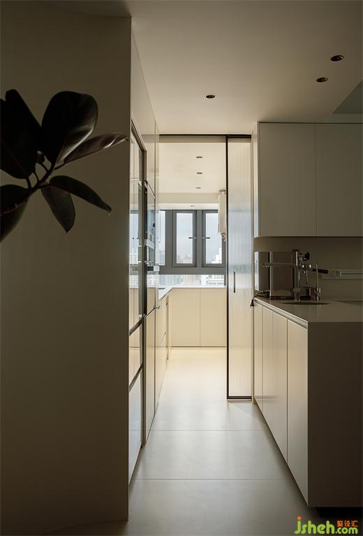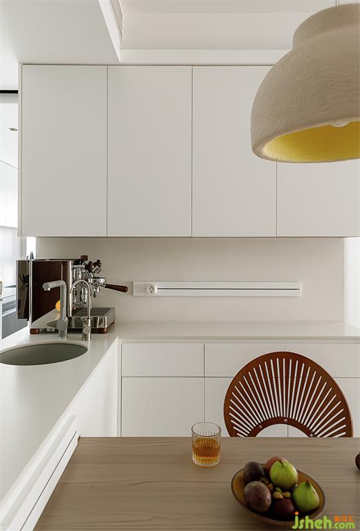 原本的廚房特別小,不足以滿足日常生活所需。境相設(shè)計師將原廚房外移一點作中廚使用,原餐廳處增加西廚與中廚連接搭配使用,一扇移門靈活切換。