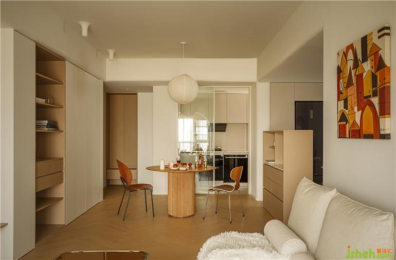 玄關(guān):進(jìn)門推掉廚房墻后做成L型鞋柜,有了足夠的收納空間和換鞋凳