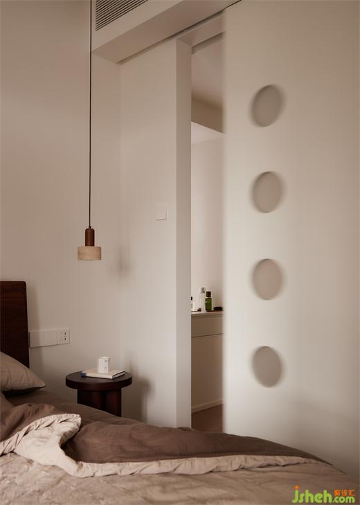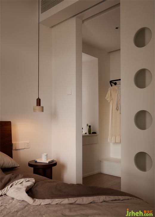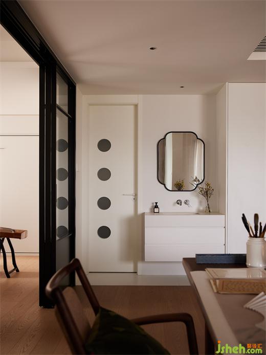 主臥:主臥房門一門兩用,衛(wèi)生間改為掛衣區(qū)與梳妝臺,房門打開后,儼然變成了一個大套間,餐廚區(qū)客廳,主臥,次臥,流動性動線