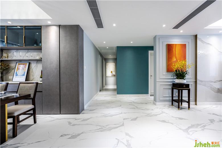 一進(jìn)門你就會(huì)發(fā)現(xiàn)驚喜所在,引入眼簾的就是灰調(diào)的跳躍性過渡,淺灰—亮色綠—深灰的撞色處理就像是色塊跳躍,讓人眼前一亮。Johnny哥還考慮到風(fēng)水問題,為了避免“開門見廁”的,與上個(gè)紫龍府案例不一樣的做法是直接扭轉(zhuǎn)衛(wèi)生間門口。