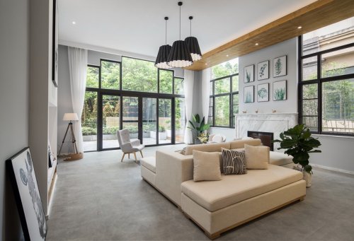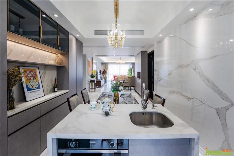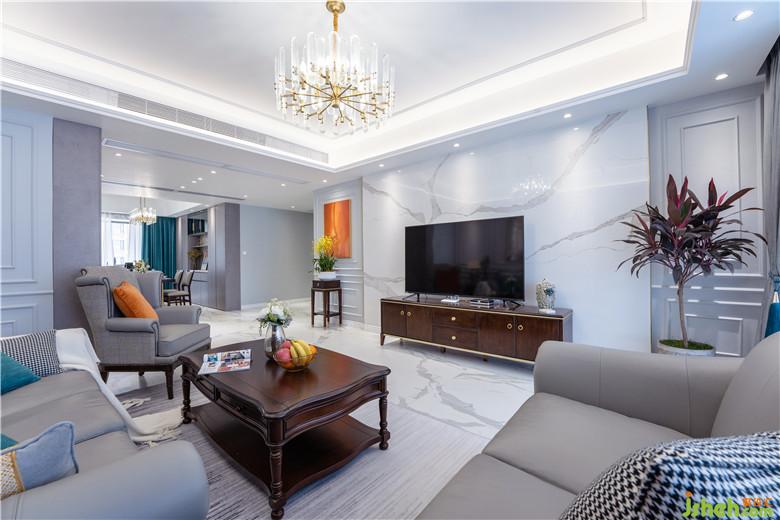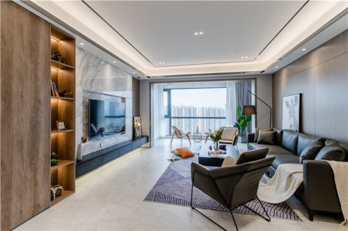 在效果圖階段,本來客廳就是灰調(diào)子作為基調(diào),畢竟沙發(fā)調(diào)子已經(jīng)定死了,所以Johnny哥就順勢(shì)將客廳以灰調(diào)用作客廳基調(diào),大理石地磚為底調(diào),紋理間的碰撞,完美銜接,落地玻璃外的美景盡收眼底。