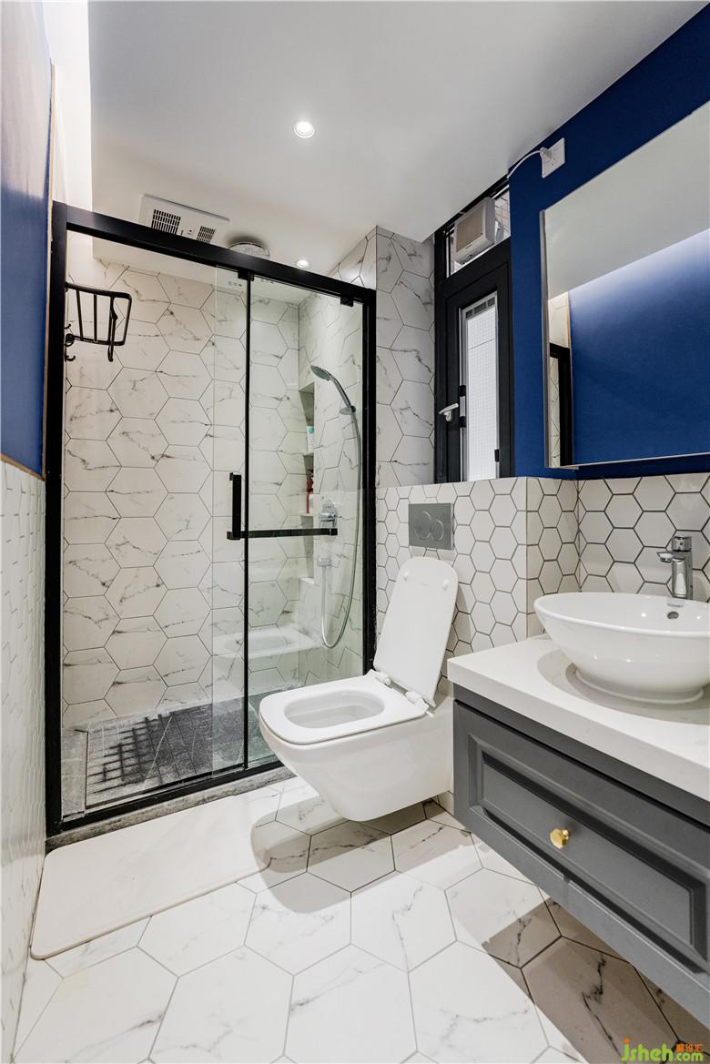衛(wèi)生間異?;钴S有木有!區(qū)別以往的衛(wèi)生間,Johnny哥用大色塊藍(lán)色調(diào)去提亮衛(wèi)生間,腰線(xiàn)以上是藍(lán)色腰線(xiàn)一下式六角磚鋪貼,莫名的復(fù)古feel。入墻式排水的馬桶上方還可以放置小物件呢!雖說(shuō)整個(gè)衛(wèi)生間空間都是六角磚,但是干濕分區(qū)用的是兩種尺寸規(guī)格的六角磚,無(wú)形中就區(qū)分開(kāi)來(lái)了。