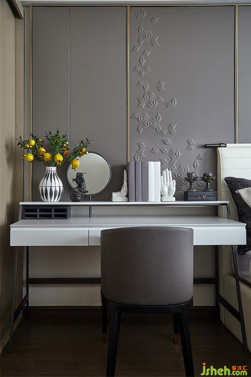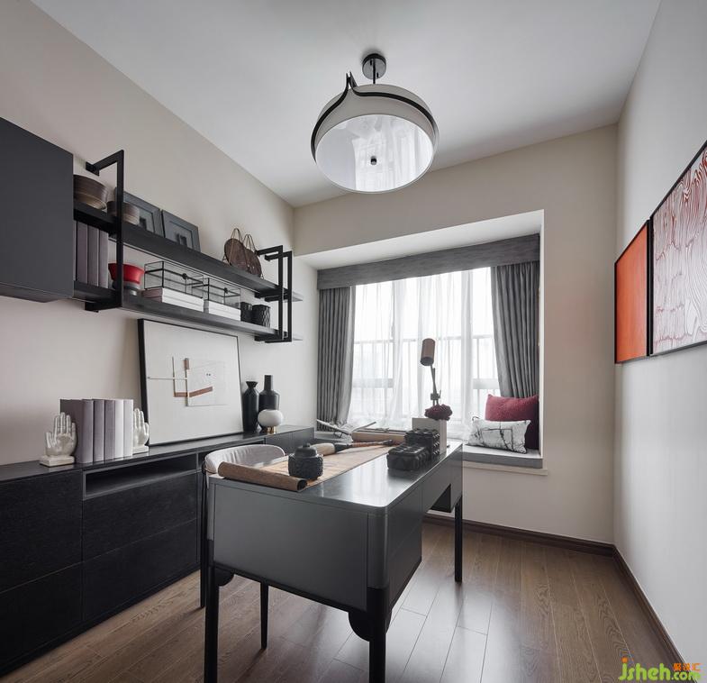 書房以黑色為主色調(diào),沉穩(wěn)內(nèi)斂,橙色的掛畫在空間中起到了點(diǎn)綴的作用,細(xì)微處更見品質(zhì),充滿著一股瀟灑風(fēng)雅的書卷氣,一幅“室雅何須大,花香不在多”的閑適生活情境映入眼前。