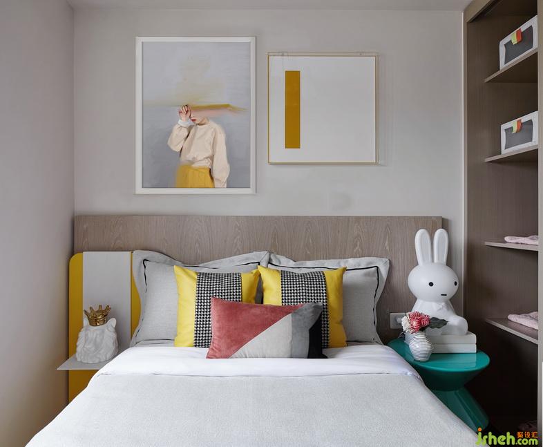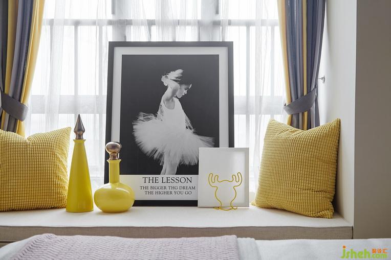 兒童房的空間中,白色是主要的基調(diào),姜黃色的床品在室內(nèi)作點(diǎn)綴。孩子的世界總是豐富多彩的,隨處可見的兒童擺件,和一幅穿芭蕾裙的女孩的照片,呈現(xiàn)出童真和極富藝術(shù)氣質(zhì)的空間。