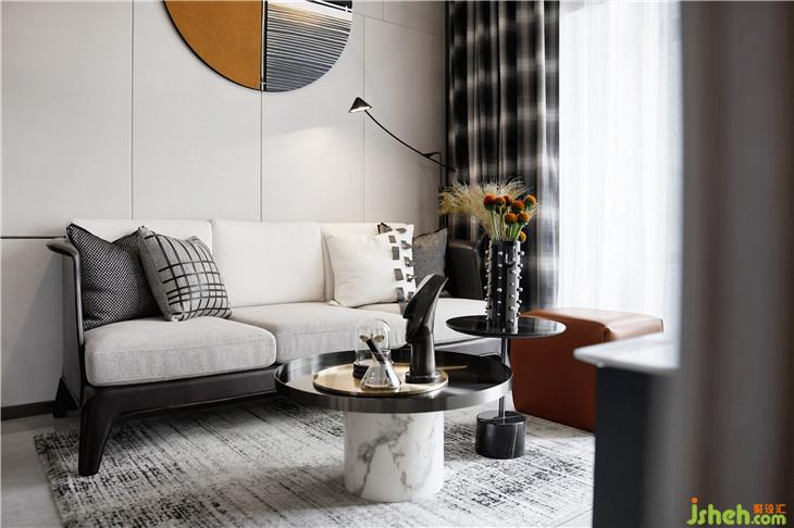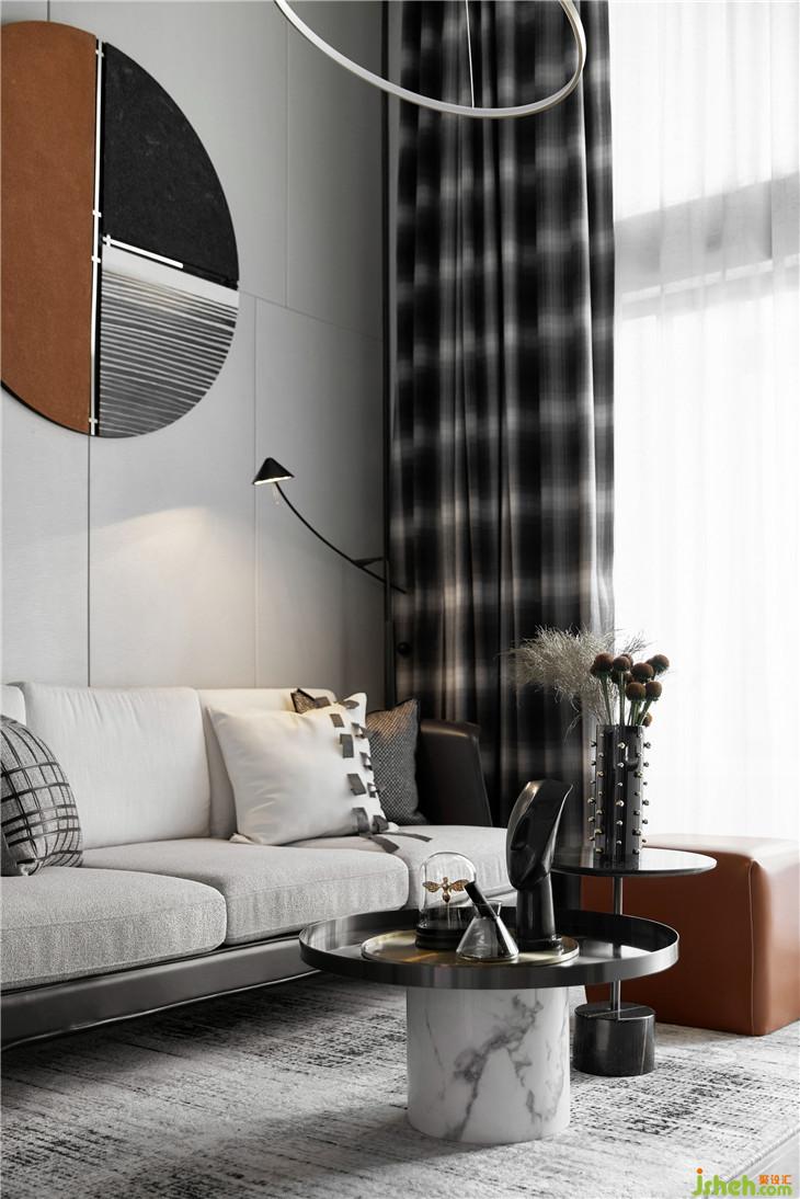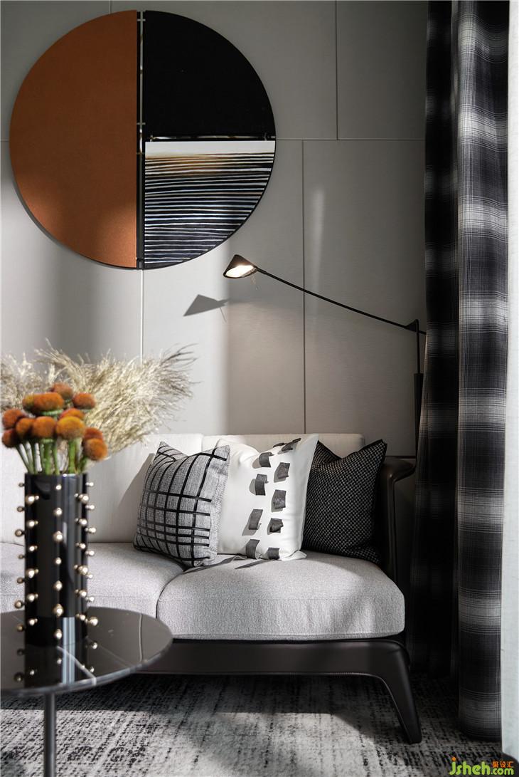無(wú)論是靈動(dòng)光圈的燈飾,抑或充滿(mǎn)層次感的茶幾,窗簾上的格紋,甚至是花瓶上的鉚釘,都是卸下中規(guī)中矩這個(gè)枷鎖的利器。赤茶色掛畫(huà)、掛飾與坐凳的加入緩和了強(qiáng)烈的個(gè)性,注入溫潤(rùn)的氣息。