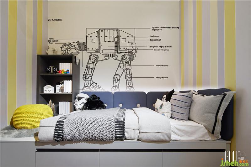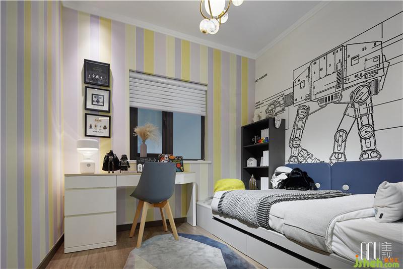 客臥與男孩房在整體色調(diào)基礎(chǔ)上,根據(jù)房間的不同功能調(diào)節(jié)了顏色配比,在黃色這類膨脹色的運(yùn)用上,客臥調(diào)減了比例,男孩房則相對(duì)調(diào)增,呈現(xiàn)出穩(wěn)重與活力兩種傾向。讓形式服從功能,附加裝飾點(diǎn)到為止,是北歐簡(jiǎn)約風(fēng)的最佳注釋。