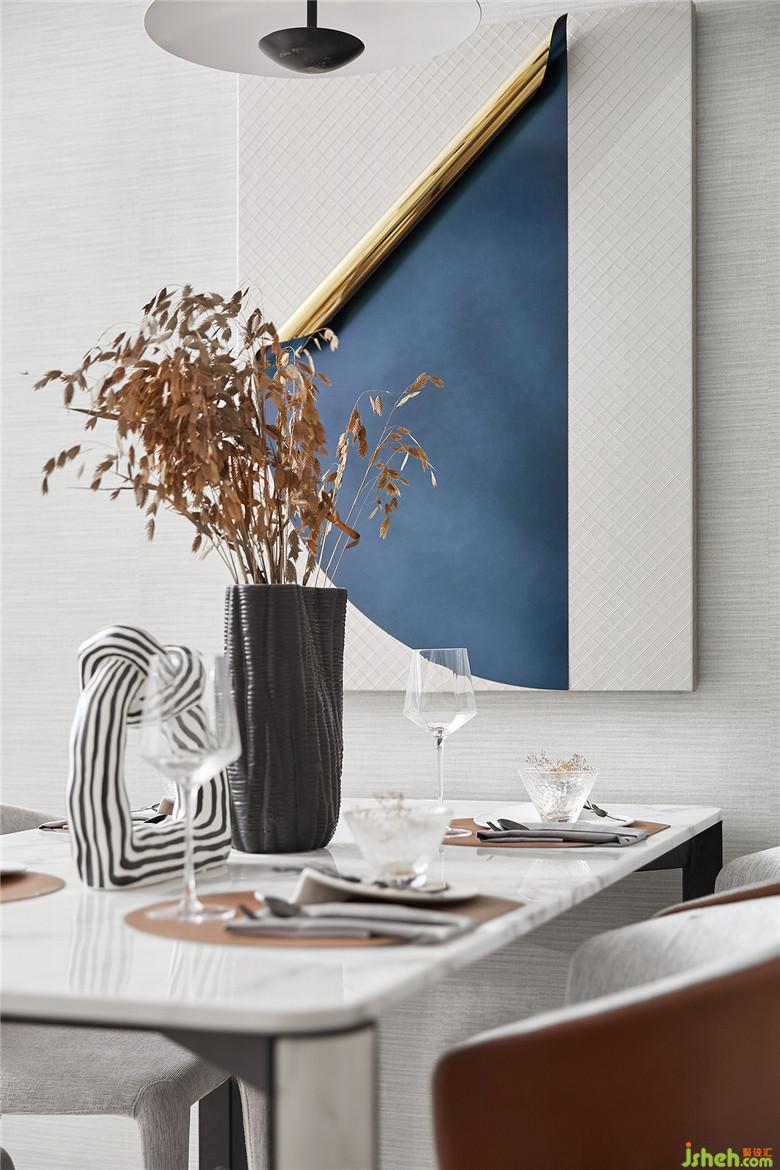 客廳空間褪去浮華的裝飾,以素白與雅灰為主,小面積的咖色與藍色帶起節(jié)奏感。從陶藝文化中萃取而來的元素,化為各種性格鮮明的線條、形狀和肌理,充斥在空間的細節(jié)處。藝術(shù)與生活的邊界在此彌散,營造出靜謐而有格調(diào)的閑適光景。