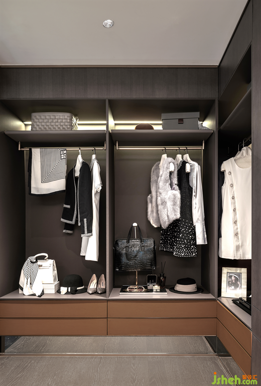樣板房設(shè)計極致地利用空間,將270度的轉(zhuǎn)角飄窗打造成開放式衣柜,以更契合居者的品味格調(diào),刻畫藝術(shù)情致。