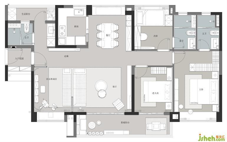 長輩房利用衣柜與飄窗設計成加長版床頭柜,既充分利用了非常雞肋的“死角”空間,亦延長了空間的橫軸視覺效果,樣板房設計優(yōu)化了原建筑的尺度舒適感。同時,長輩房可直通長達7米的陽臺,可瞰無邊際的自然風景,生活的意味被無限延長。