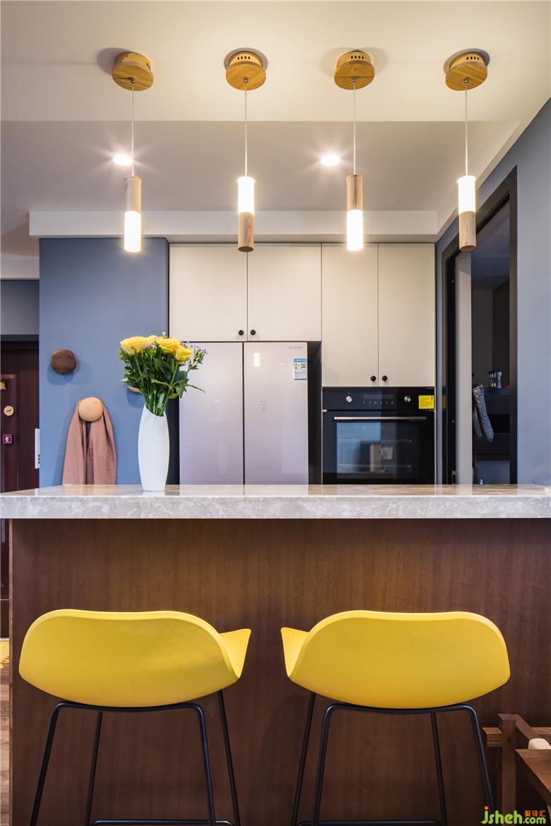 廚房陽臺取消,作為中廚一部分,并把廚房分為2部分,外面設(shè)置了吧臺,烤箱蒸箱位置,里面又個獨立的中廚。入戶靠右邊的廚房墻面拿掉后,整個進門視野變得也開闊了,同時增加了采光。整個廚房與廳里的互動性也曾強。