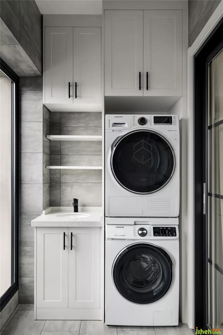 陽臺空間往外推,次臥和陽臺區(qū)域留出陽臺儲物柜得區(qū)域,洗衣機(jī)烘干機(jī)為上下重疊得方式。