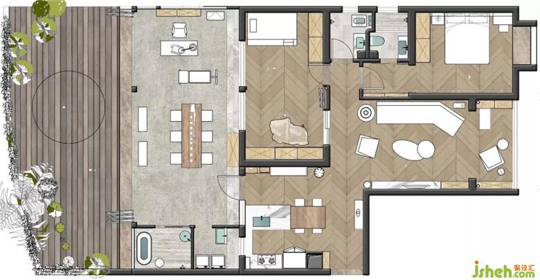 露臺(tái)搭建了一個(gè)功能陽(yáng)光房,地面保留了原有的戶(hù)外木.