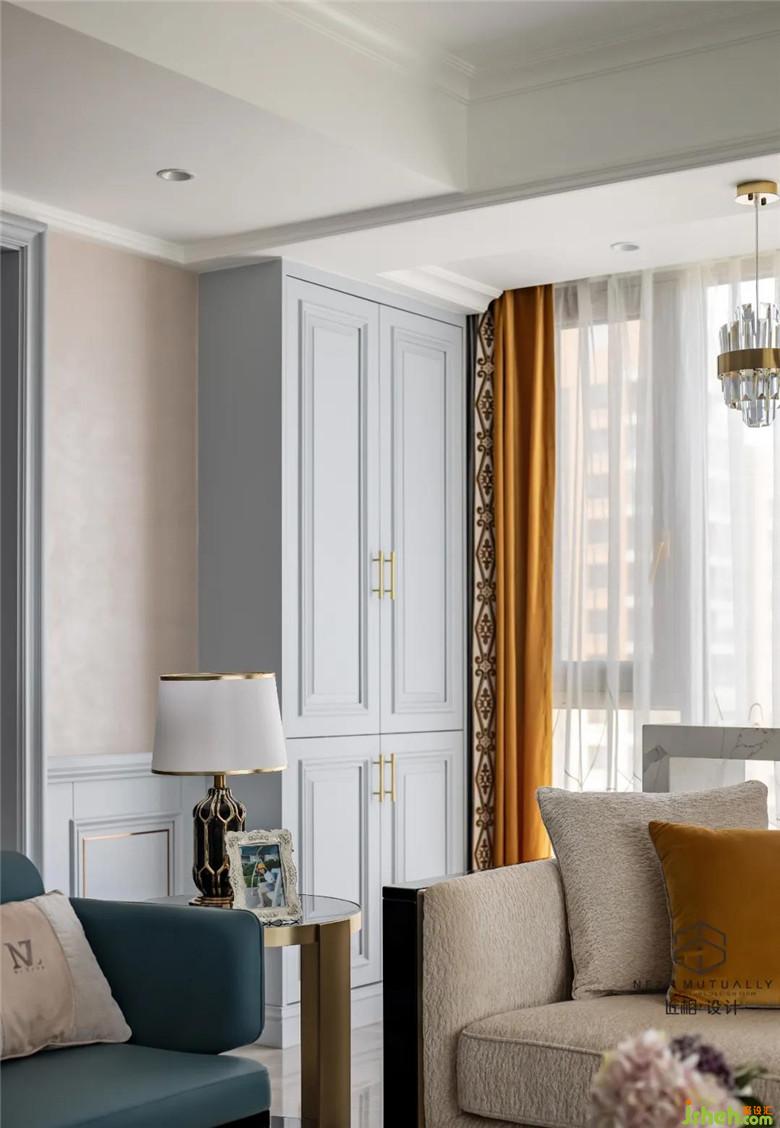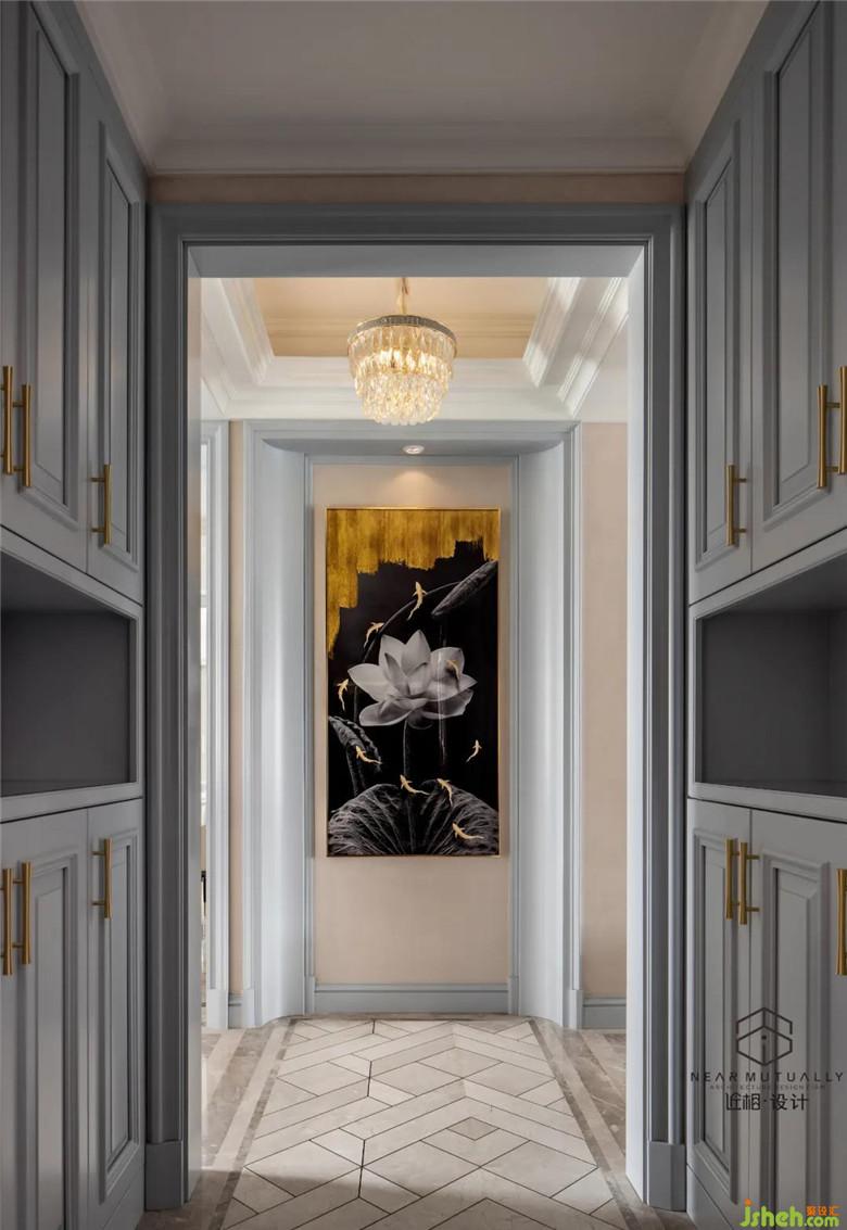 金色把手的白色飾面的收納柜,顏值高,占地少,裝修公司用美式輕奢的簡潔精致從入門處即優(yōu)雅呈現(xiàn)。