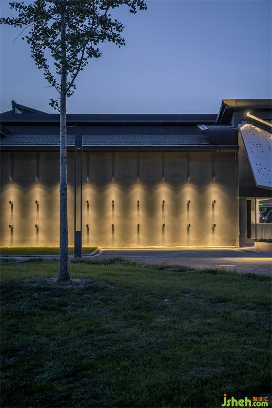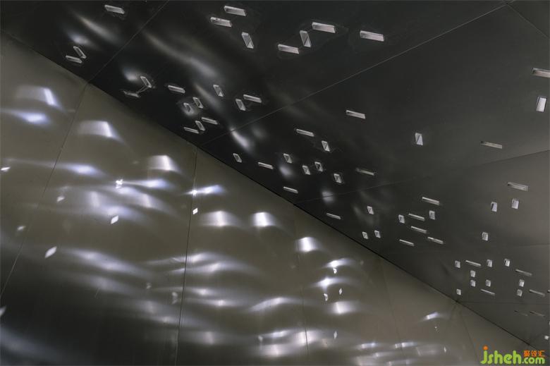 The SouthFa?ade iscovered with a matrix of 54 steel light boxes. These protruded rectilinear structures cast an array of shadows onto the grey stucco wall. The angle and the lengths of the shadows constantly change throughout the day according to the solar position. Downlights are also embedded into the box to light up the fa?ade creating another kind of pattern during the nighttime. These structures can also be used to hang large posters or displays that may be required by the museum for different events.