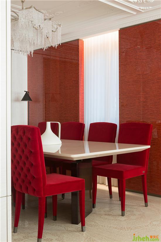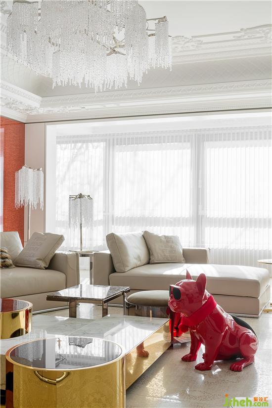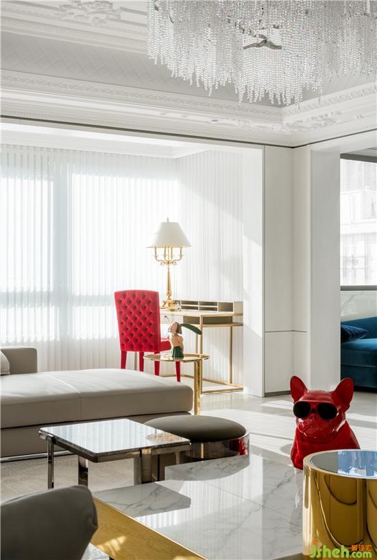 家,是與家庭成員生活在其中的舒適場域,而白色是現(xiàn)代都市風(fēng)格的靈魂,更是映襯客廳寬闊尺度與自然光線的絕佳色調(diào)。私宅設(shè)計在白色調(diào)的基礎(chǔ)上雕花,描摹細(xì)節(jié)的藝術(shù),同時以小范圍點綴的形式,將濃烈而華麗的紅調(diào)注入空間之中,打破了純粹當(dāng)代的刻板氣息。絲絨單椅、皮質(zhì)沙發(fā)、漆面小狗擺件、水晶流蘇燈飾、描金藝術(shù)裝置畫......空間中的一切組合相互融合,注入一抹活潑靈動的氣韻,讓居者同時品味生活的藝術(shù)感與煙火氣。