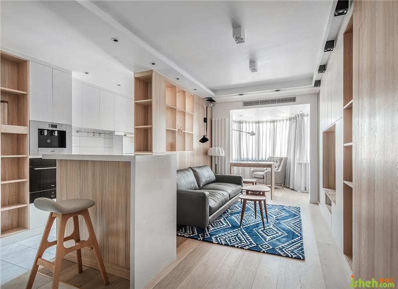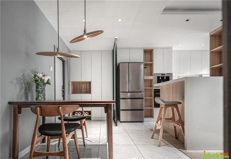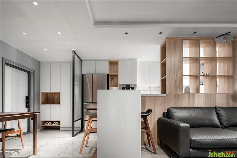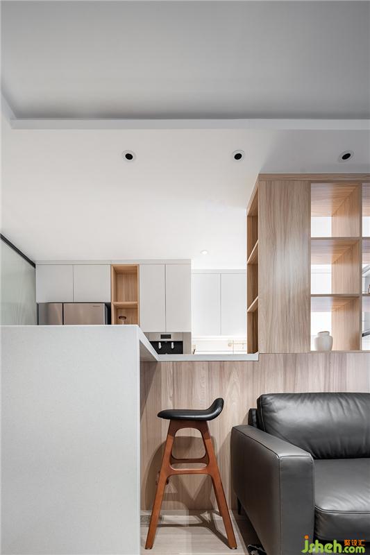 干凈的白色石材與柜板做了內(nèi)嵌,單純得簡單。作為廚房和客廳,客廳與餐廳之間的過度功能,吧臺(tái)顯然有著不錯(cuò)的獨(dú)特作用。沙發(fā)和吧臺(tái)之間有一段800mm的距離,方便對(duì)坐吧椅擺放。