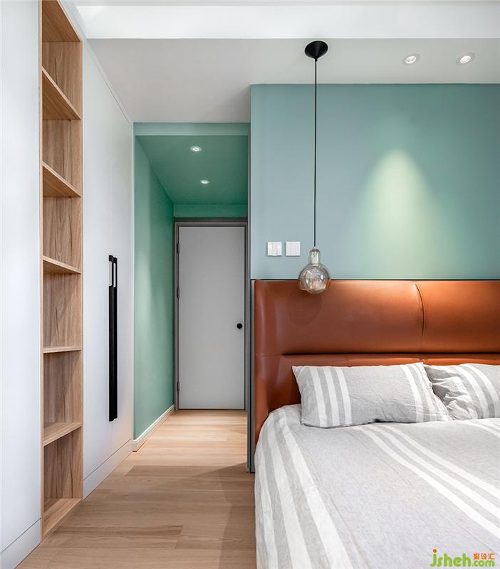 弱飽和的綠色調(diào),搭配皮質(zhì)深栗色床頭軟包,一種清新明快,一種沉寂安逸。留給床頭的面積微乎其微,只有從頂上懸吊下來的小吊燈,是Rebea睡前夜讀時(shí)最大的滿足。