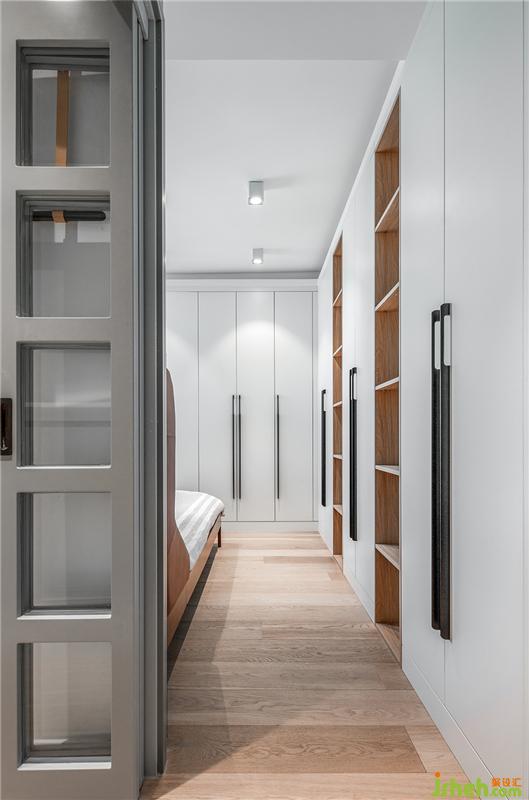 臥室門前1800mm的小過道旁邊,有一道透光的玻璃折疊門,保證了空間通透性,里面其實(shí)就是床頭背后的衣帽間。