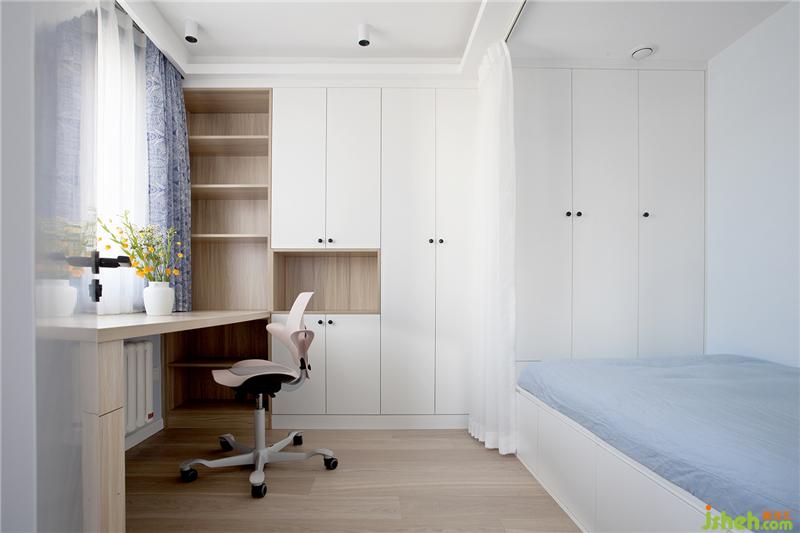 靠窗的學(xué)習(xí)區(qū),設(shè)計(jì)了整張工作臺(tái),一直延伸到里面的書格,也和旁邊的儲(chǔ)物柜縱橫交錯(cuò)在了一起。桌板的寬度做的稍微大一些,這樣就不擔(dān)心經(jīng)常讓腳踢到暖氣。