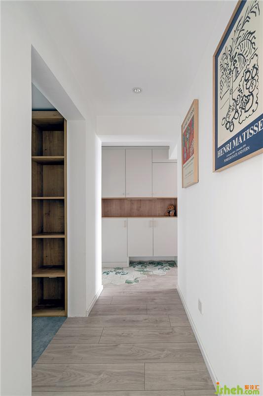 通往次臥的走廊,改變了原來進(jìn)入廚房的入口。這樣廚房門與衛(wèi)生間門并不正對,也給過道區(qū)域預(yù)留了足夠的裝飾墻面。