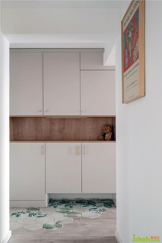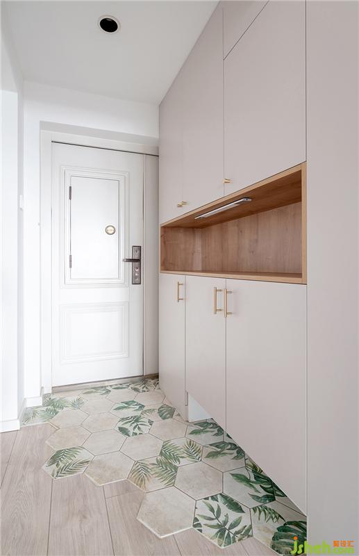 門廳區(qū)域,用了部分六角磚與地板做拼接,進(jìn)門后可以在瓷磚區(qū)域更換外穿鞋。